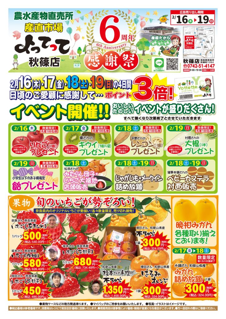 本日2/16(木)〜2/19(日)の4日間、「6周年感謝祭」を実施をいたします🎊🎊🎊 地元生産者さんの「野菜」「果物」「お米」「お菓子」など取り揃えております! 人気の「お魚」「お肉」もお買い得です🙌
