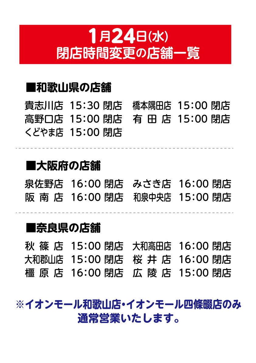 閉店時間変更のお知らせ【1月23日・1月24日】