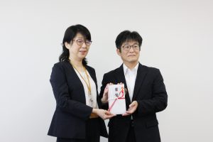 寄付目録を贈呈された田辺市教育委員会 狼谷教育次長(左)と株式会社プラス取締役 管理本部長 松本(右)